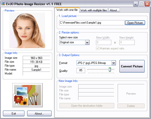 EvJO Photo-Image Resizer este un program pentru modificarea marimii imaginilor, poti modifica cu usurinta o fotografie pentru a o folosi intr-o pagina web sau pentru a o trimite prin email.